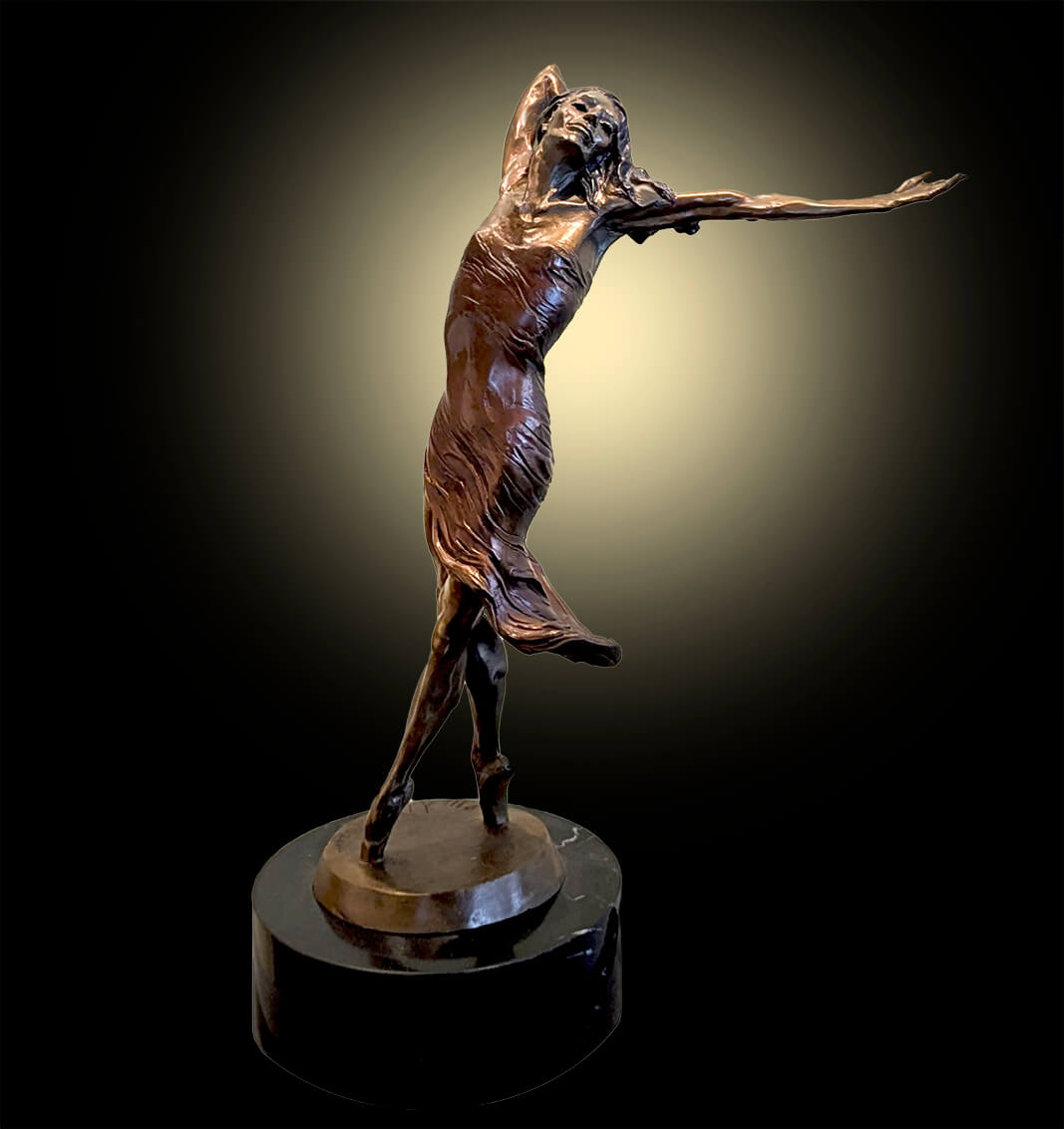 Invitation to dance is a bronze ballet dance sculpture. The female dancer stretches her arm out in a gesture that says to the viewer “come dance with me“. Her other arm bends up and her hair envelopes her hand in back of her head with the fingers revealed coming through the strands in the back of the head.
